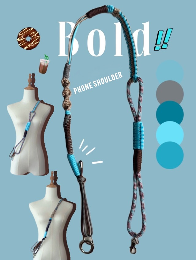 カラー:パステルブルー・ブラウン・グレー(マーブル) 長さ:金具含め 132cm ― ハンドストラップ 44cm / ショルダーパーツ 92cm 丸カンを外せば、ハンドストラップとしても使える2Way仕様のスマホショルダー。 ショルダーパーツは、ハンディファンや小物用ストラップとしてもちょうどいい長さです。 金具部分にはサングラスやミニポーチを掛けることもでき、身軽にお出かけしたいときに便利。 複雑に編み込まれたコードは高い強度を持ち、実用性も抜群です。 機能性とファッション性を兼ね備えた、オンにもオフにも活躍する一本です。